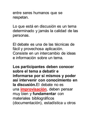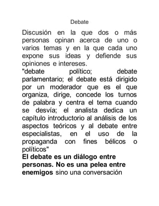 El documento define el debate como una discusión entre dos o más personas sobre uno o varios temas, donde cada persona expresa e intenta defender sus ideas u opiniones. Explica que el debate requiere que los participantes se preparen sobre el tema, presenten argumentos fundamentados y respeten las reglas de un diálogo ordenado y respetuoso.
