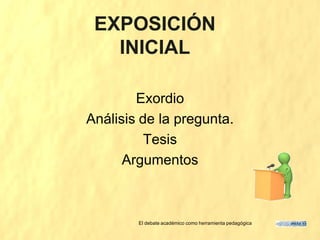Este documento describe las etapas y estructura de un debate académico, incluyendo la exposición inicial, los argumentos a favor y en contra, y las refutaciones. Se divide en una introducción, desarrollo de tres argumentos principales, respuestas y refutaciones de cada equipo, y una conclusión. El objetivo es utilizar el debate como una herramienta pedagógica para analizar diferentes perspectivas de un tema.