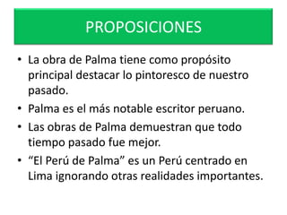 El documento presenta cinco proposiciones sobre la obra de Ricardo Palma, incluyendo que destaca lo pintoresco del pasado peruano y muestra que el pasado fue mejor. También incluye un cronograma de debates para las clases del 13 y 15 de septiembre donde diferentes grupos debatirán a favor y en contra de varios temas relacionados a la obra de Palma.
