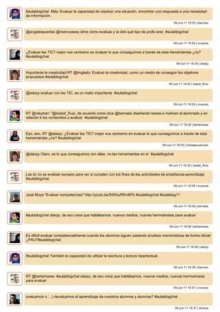 Este documento resume un debate en Twitter sobre la evaluación de las competencias y el aprendizaje de los estudiantes. Los participantes discuten cómo evaluar las habilidades adquiridas a través del uso de las TIC en lugar de evaluar las propias herramientas. También debaten sobre la necesidad de evaluar competencias en lugar de conocimientos memorísticos y cómo la evaluación actual se centra demasiado en los exámenes.
