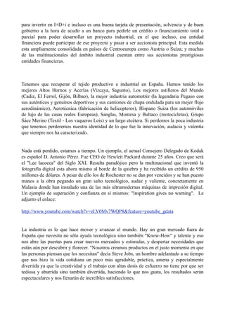 El documento argumenta que España debe volver a producir y fabricar para recuperar su identidad industrial. Señala que la falta de estudios de mercado y la falta de previsión financiera han llevado a muchos proyectos empresariales al fracaso, y propone que España debe centrarse en la I+D para desarrollar tecnología más avanzada y así competir cuando los costes laborales aumenten en otros países.