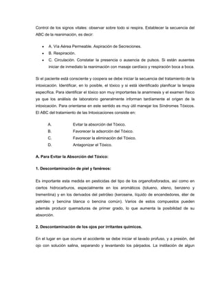 Este documento proporciona información sobre la prevención e intervención en casos de intoxicación. Explica los pasos para asegurar la vida del paciente intoxicado, como controlar los signos vitales y establecer la secuencia ABC de reanimación. También describe formas de evitar la absorción del tóxico, como la descontaminación, emesis, lavado gástrico y uso de absorbentes como el carbón activado. Finalmente, brinda recomendaciones para la terapia de soporte e instituciones gubernamentales que asisten a pacientes intoxicados.