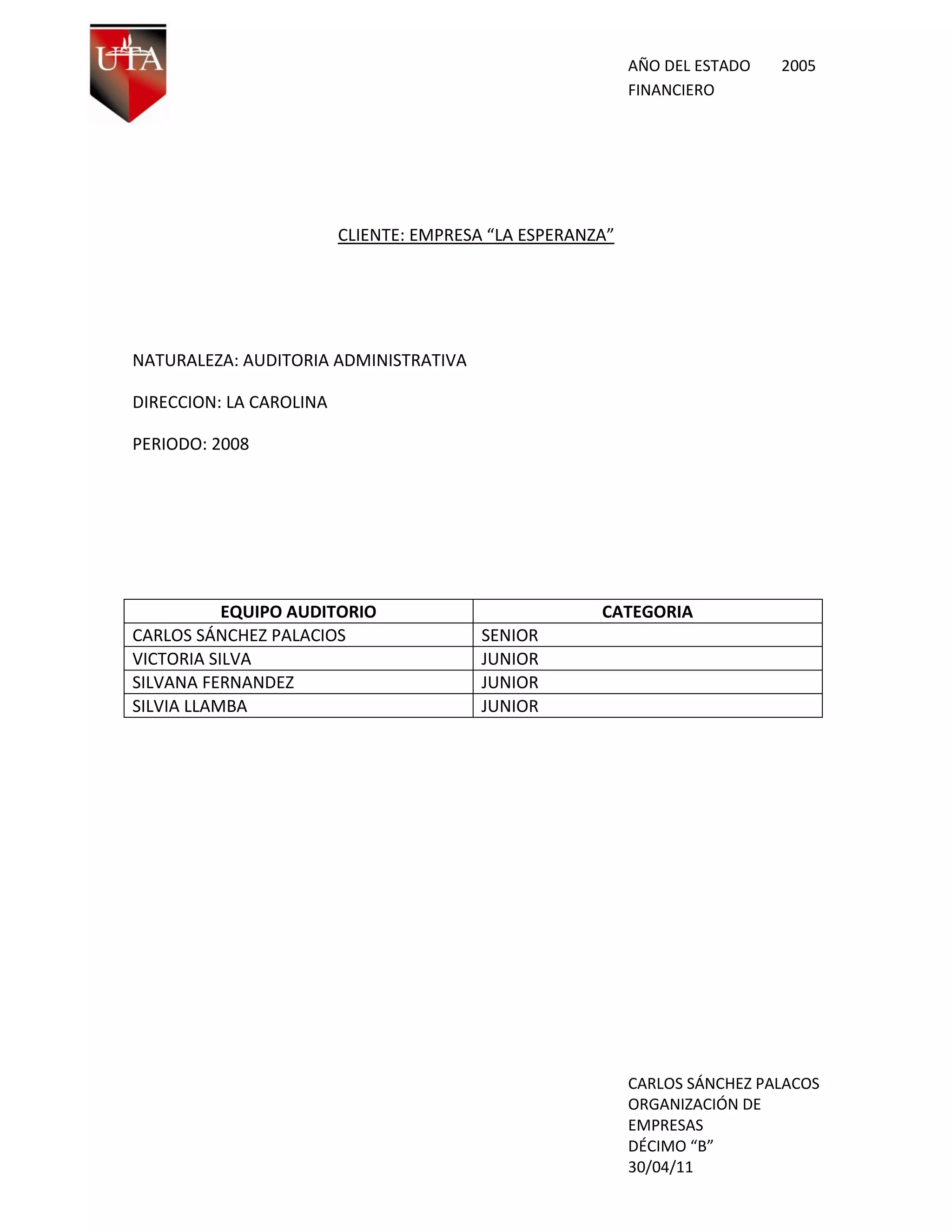 El documento presenta un informe de auditoría administrativa realizada a la empresa "La Esperanza" en el año 2008. El equipo auditor estuvo conformado por Carlos Sánchez Palacios como auditor senior y Victoria Silva, Silvana Fernández y Silvia Llamba como auditores junior. El informe analiza la información financiera contable de la empresa, incluyendo estados financieros, hojas de trabajo, asientos de ajuste y puntos de control internos. También analiza componentes como caja, bancos y cuentas por cobrar.