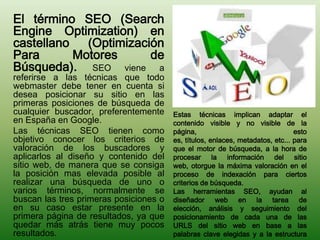 El documento habla sobre la optimización para motores de búsqueda (SEO), que son técnicas para posicionar un sitio web en las primeras posiciones de los resultados de búsqueda. Estas técnicas implican adaptar el contenido visible y no visible de una página para que los motores de búsqueda lo valoren más alto. Existen herramientas SEO para análisis, mejora y monitorización que ayudan en este proceso. También se menciona la optimización en redes sociales (SMO), que usa estrategias