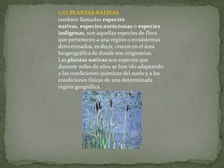 Este documento describe varias plantas nativas de Ecuador y la región de Cuenca. Explica que muchas de estas plantas nativas ahora se reproducen en viveros para ayudar a restaurar las cuencas hidrográficas dañadas. También define qué son las plantas nativas, cómo se han adaptado a las condiciones locales, y contrasta esto con las plantas invasoras exóticas.