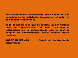 El documento habla sobre la importancia de que los ciudadanos promuevan cambios en la sociedad basados en la razón y no en el poder. También menciona que el conocimiento es el principal instrumento del que dispone el hombre para controlar la naturaleza y sobrevivir, y que las imposiciones basadas en el poder político o económico son violentas. Además, cualquier exigencia a un ser humano debe ser consensuada utilizando la comunicación y un análisis crítico racional.