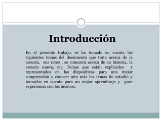 Este documento resume los principales temas relacionados con la escuela, incluyendo su historia, retos actuales, tipos de escuelas, y roles de los profesores y administradores. Explora cómo la escuela ha evolucionado para adaptarse a cambios sociales y tecnológicos, y las funciones de una escuela para proveer educación de calidad.