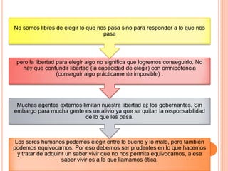 Este documento resume el primer capítulo del libro "Ética para Amador" de Fernando Savater. Explica que el capítulo destaca la importancia de la ética sobre otros conocimientos y plantea preguntas sobre por qué lo que es bueno para unos puede ser malo para otros. También discute la libertad humana y la capacidad de cada persona para tomar sus propias decisiones.
