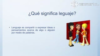 Este documento define lenguaje y comunicación. Explica que el lenguaje es compartir ideas a través de palabras, mientras que la comunicación es la transmisión de señales entre un emisor y receptor. También describe que la comunicación implica la transmisión de ideas entre dos o más personas a través del lenguaje oral o escrito, e identifica los elementos clave de la comunicación como el emisor, receptor, código, mensaje, canal y contexto.