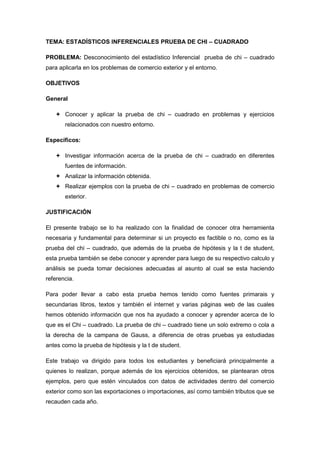 Este documento presenta información sobre la prueba de chi-cuadrado. Explica que es una prueba no paramétrica que se puede usar con variables cualitativas. Proporciona definiciones de la prueba de chi-cuadrado y el estadístico chi-cuadrado. Incluye ejemplos resueltos para ilustrar cómo aplicar la prueba y calcular el estadístico chi-cuadrado. Finalmente, explica cómo interpretar los resultados usando tablas de valores críticos de chi-cuadrado.