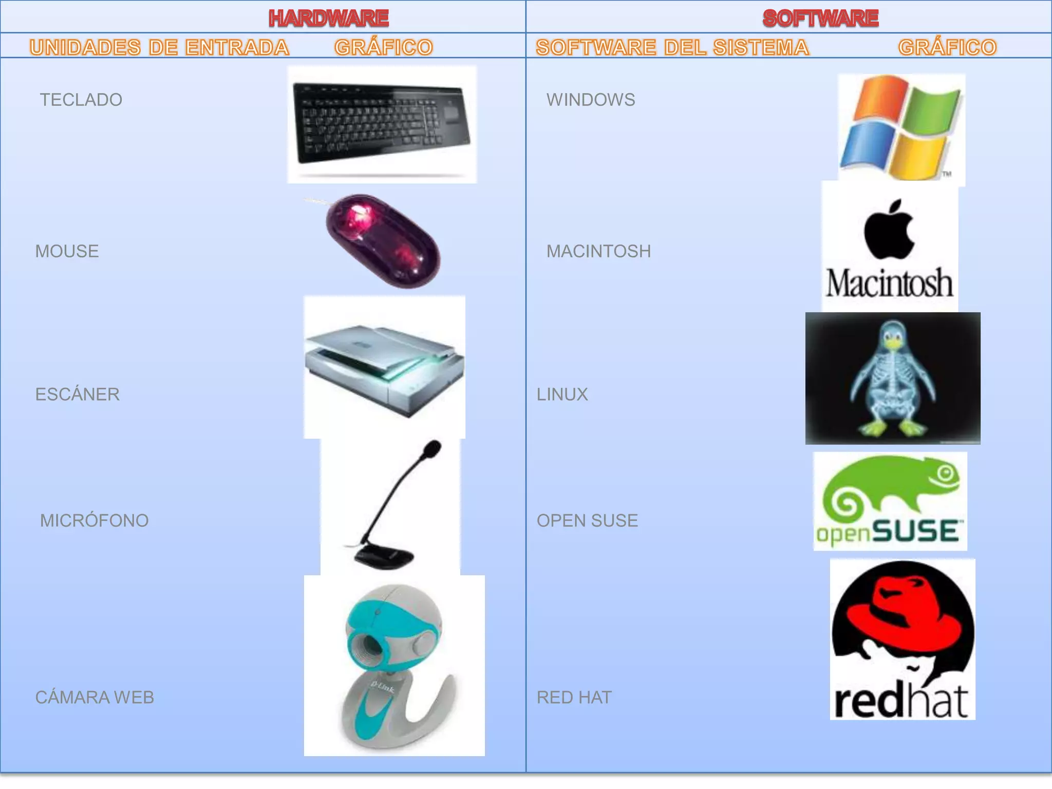 Este documento lista las principales unidades de entrada y salida de hardware de computadoras, así como varios tipos comunes de software, incluidos sistemas operativos, aplicaciones de productividad, bases de datos, comunicaciones y utilidades. El hardware incluye teclados, mouse, escáneres, cámaras web, joysticks, monitores, impresoras, altavoces y unidades de almacenamiento. El software abarca sistemas operativos como Windows, MacOS y Linux, así como procesadores de texto, hojas de cálculo, editores de imagen