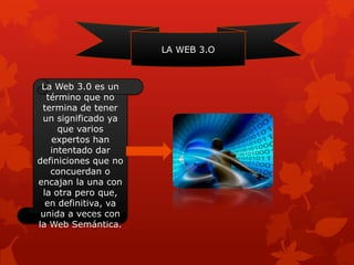 La Web 3.0 se refiere a una extensión de la World Wide Web que permitiría a los agentes de software entender y procesar el contenido de la web no solo en lenguaje natural sino también en lenguajes semánticos. Esto facilitaría encontrar, compartir e integrar información. La Web 3.0 se caracterizaría por contar con inteligencia artificial y sistemas capaces de crear contenido y ofrecer información ultrapersonalizada a cada usuario en función de su perfil y actividad previa en la red.