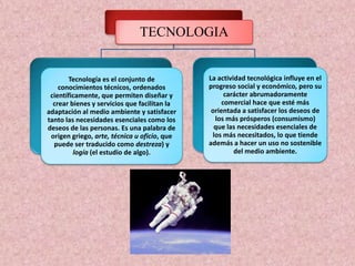 Este documento define la tecnología como el conjunto de conocimientos técnicos ordenados científicamente que permiten crear bienes y servicios para satisfacer las necesidades humanas. Explica que la tecnología influye en el progreso económico y social pero que su enfoque comercial hace que esté más orientada a satisfacer los deseos de los más prósperos que las necesidades de los más necesitados. También señala que es un error denominar tecnología solo a la tecnología informática.