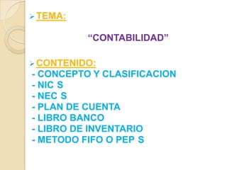 Este documento resume los conceptos básicos de la contabilidad como el arte de registrar movimientos financieros para informar a los interesados, y clasifica la contabilidad en general, comercial, de costos y otras. Explica las normas NIC's y NEC's, el plan de cuentas, libros bancarios e inventarios, y el método FIFO para valuar existencias.