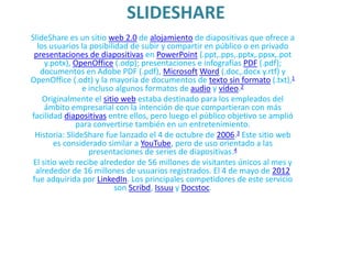 SlideShare es un sitio web que permite a los usuarios subir y compartir presentaciones de diapositivas, documentos PDF, archivos de texto y algunos formatos de audio y video. Originalmente estaba destinado a compartir presentaciones entre empleados, pero luego se amplió para el público en general. Fue lanzado en 2006 y actualmente recibe alrededor de 56 millones de visitantes mensuales, siendo adquirido por LinkedIn en 2012.