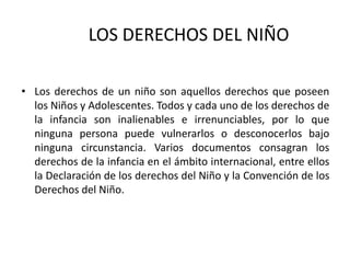 Este documento resume los principales derechos de los niños, incluyendo el derecho a la educación, al juego y a la salud. Explica que los derechos de los niños son inalienables e irrenunciables y están consagrados en documentos internacionales como la Declaración de los Derechos del Niño y la Convención sobre los Derechos del Niño. También destaca que los niños tienen derecho a crecer de forma integral con dignidad y calidad de vida a través del desarrollo y ejercicio pleno de sus derechos.