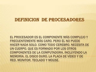 Este documento habla sobre los procesadores de computadoras. Define al procesador como el componente más complejo que necesita de otros componentes como la memoria y disco duro para funcionar. Luego enumera diferentes tipos de procesadores por marca e historia de velocidades. Finalmente explica que la velocidad de los procesadores se mide en megahertz.