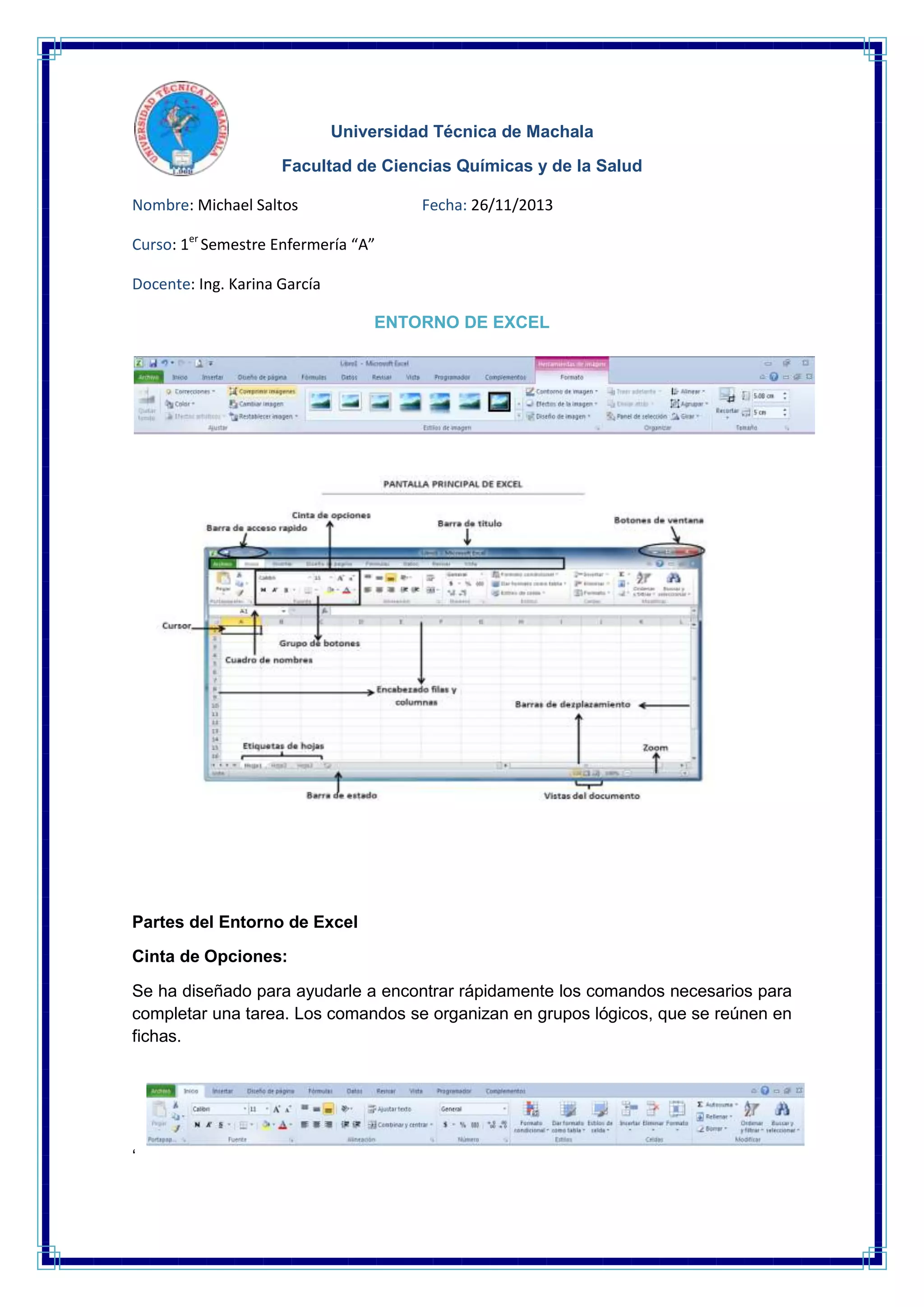 El documento describe los componentes básicos del entorno de trabajo de Excel como la cinta de opciones, el nombre de las celdas, el cuadro de nombres y la barra de fórmulas. También explica cómo cambiar el nombre de las hojas de trabajo y cómo insertar, eliminar, y formatear celdas, filas y columnas.