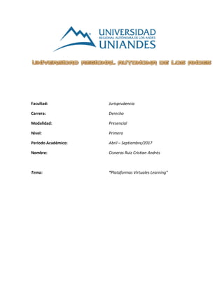Este documento resume las principales plataformas de aprendizaje virtual como e-learning, u-learning, b-learning y m-learning. E-learning se refiere a sistemas de aprendizaje en línea que permiten la creación de aulas virtuales. U-learning se refiere al aprendizaje ubicuo a través de diferentes dispositivos. B-learning involucra una combinación de aprendizaje presencial y en línea. M-learning usa dispositivos móviles como teléfonos inteligentes para el aprendizaje. El documento con