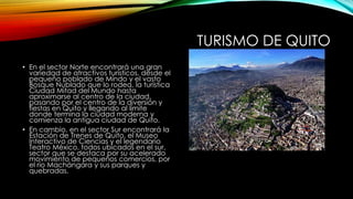 El documento contiene información sobre la ciudad de Quito, Ecuador. Describe las atracciones turísticas en el norte y sur de la ciudad, incluyendo el Bosque Nublado de Mindo y el Museo Interactivo de Ciencias. También proporciona detalles sobre el clima templado de Quito, su arquitectura colonial y su designación como Patrimonio Cultural de la Humanidad.