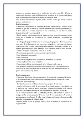 El documento presenta un informe de investigación sobre las posibles causas por las que los niños no quieren ir a la escuela. Identifica varios factores como el apego excesivo a los padres, problemas en la escuela como acoso de compañeros o metodologías de enseñanza aburridas, y problemas emocionales o de aprendizaje no diagnosticados. El documento también resume las hipótesis planteadas sobre cómo abordar esta situación a través de una mejor comunicación entre padres, maestros y alumnos, y creando un ambiente escolar más
