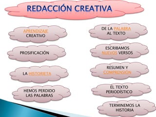 El documento presenta diferentes técnicas creativas para trabajar con el lenguaje y la escritura como la prosiificación, la creación de versos, el uso de la historieta y el resumen. Explica elementos como viñetas, globos y convenciones para organizar una historieta y características básicas de un resumen como objetividad, pertinencia y coherencia.