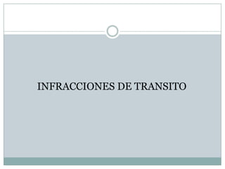 Este documento describe las infracciones de tránsito y las leyes de tránsito en Ecuador. Algunas infracciones incluyen no estacionar correctamente, manejar en estado de ebriedad, y no obedecer señales de tránsito. Las infracciones pueden ser delitos o contravenciones, y se deben perseguir dentro de ciertos plazos. Los conductores deben respetar las leyes para proteger la seguridad de todos los usuarios de las vías.