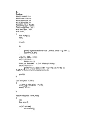 Este documento presenta código de programación en C/C++ para realizar diferentes tareas como ordenar arreglos, calcular promedios y desviaciones estándar, contar frecuencias, y asignar asientos en un avión. Incluye funciones para leer datos, ordenar arreglos, calcular promedios y desviaciones, y mostrar resultados.