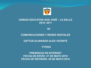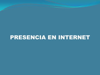 Este documento describe los tres elementos necesarios para tener presencia en Internet: 1) Un nombre de dominio que permita la fácil localización de una empresa o proyecto, 2) Espacio de almacenamiento en un servidor web (hosting) para alojar el sitio, y 3) Contenido para el sitio. Además, explica que tener una página en Facebook no es suficiente y que un sitio web detallado con información de contacto y sobre productos/servicios es imperativo para los negocios en la era digital.