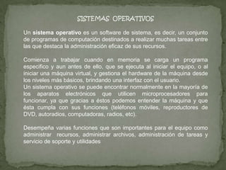 Este documento trata sobre los sistemas operativos. Explica que un sistema operativo es un software que administra los recursos de una computadora y permite la interacción con el usuario. Describe algunos sistemas operativos comunes como DOS, Windows y Mac OS. También menciona algunos comandos básicos de DOS y concluye que el sistema operativo es fundamental para el funcionamiento de una computadora.