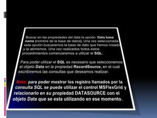 Este documento describe SQL, incluyendo que es un lenguaje de consulta estructurado normalizado para bases de datos. Explica los diferentes tipos de comandos SQL como DML para manipular datos y DDL para crear, modificar y eliminar objetos de la base de datos. También describe cláusulas como WHERE, FROM y HAVING, y operadores lógicos como AND, OR y NOT.