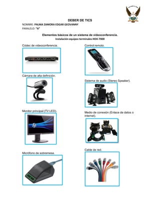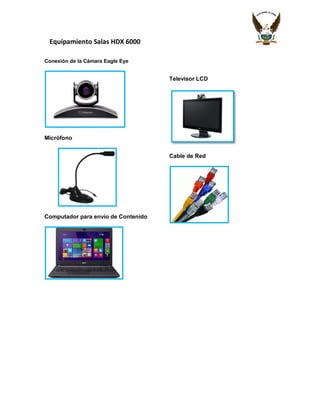 El documento describe los elementos básicos de un sistema de videoconferencia instalado en dos salas. En la sala HDX-7000 se instalaron un códec de videoconferencia, una cámara de alta definición, un monitor principal, un micrófono de sobremesa, un control remoto, un sistema de audio y un medio de conexión. En la sala HDX 6000 se instalaron una cámara Eagle Eye, un micrófono, un computador para envío de contenido, un televisor LCD y un cable de red.