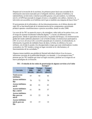 El documento describe las tecnologías de la información y la comunicación (TIC), incluyendo su definición, historia y evolución. Explica que las TIC agrupan elementos como la informática, internet y las telecomunicaciones y cómo han cambiado la vida de las personas al facilitar el acceso y el intercambio de información.