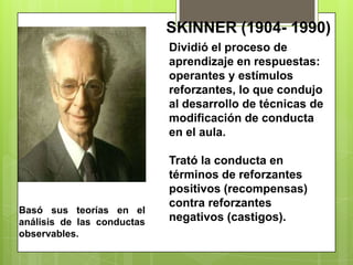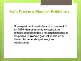 Ivan Pavlov fue un fisiólogo ruso que descubrió el condicionamiento clásico. Realizó experimentos en los años 1890 que demostraron la existencia de reflejos condicionados en perros, estableciendo las bases de las teorías conductistas. Sus hallazgos tuvieron gran influencia en el desarrollo de la psicología.