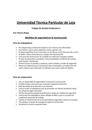 Este documento proporciona recomendaciones de seguridad para trabajadores, empresarios y visitantes en obras de construcción. Detalla medidas como usar equipo de protección como cascos, guantes y botas, así como seguir señalizaciones y no ingresar a áreas de alto riesgo. También incluye consejos para reducir ruidos y riesgos eléctricos, y normas de seguridad industrial que deben cumplirse.