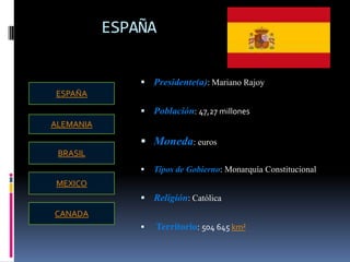 Este documento proporciona información básica sobre cinco países: España, Alemania, Brasil, México y Canadá. Para cada país se incluye el nombre del presidente, la población, la moneda, el tipo de gobierno, la religión predominante y el territorio.