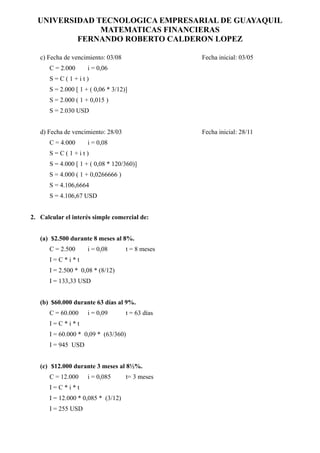Este documento presenta varios problemas de matemáticas financieras relacionados con el cálculo de intereses simples y compuestos de pagarés y préstamos. Incluye tablas de referencia de días por mes y problemas que calculan fechas de vencimiento, montos de vencimiento, intereses simples comerciales e intereses exactos para diferentes escenarios de plazos e intereses.