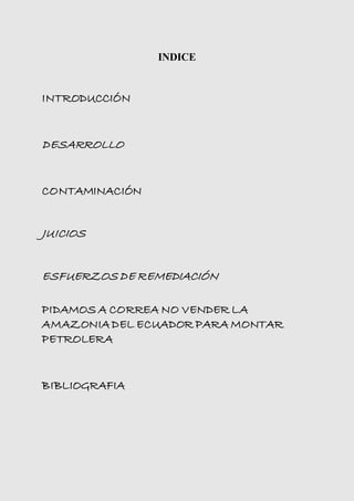 El documento resume la historia de la contaminación en los campos petroleros de la Amazonía ecuatoriana por parte de Texaco entre 1964 y 1990, los juicios subsiguientes contra Texaco (ahora Chevron), y los esfuerzos actuales del gobierno ecuatoriano para expandir la industria petrolera en la región a pesar de la oposición de los pueblos indígenas y grupos ambientalistas.