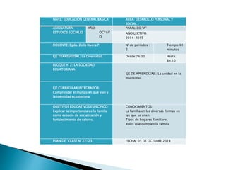Este documento presenta información sobre una lección de estudios sociales sobre la familia para estudiantes de octavo grado. Explica que la lección se centrará en explicar la importancia de la familia como espacio de socialización y fortalecimiento de valores. Incluye objetivos, temas, actividades planificadas y recursos didácticos para la lección.