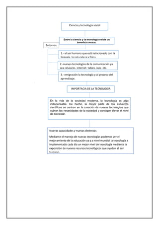 Este documento trata sobre la importancia de la tecnología en la sociedad moderna y en la educación. Explica que la mayoría de los esfuerzos científicos se centran en crear nuevas tecnologías para mejorar el nivel de vida de la sociedad. También describe cómo las nuevas tecnologías como internet, tabletas y celulares han mejorado la educación al exponer recursos tecnológicos que ayudan al ser humano.