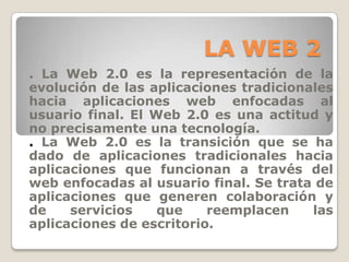 La Web 2.0 representa la evolución de las aplicaciones tradicionales a aplicaciones web enfocadas en el usuario final. No es una tecnología en sí, sino una actitud. Se trata de aplicaciones que generan colaboración y reemplazan las aplicaciones de escritorio, funcionando a través de la web. Los principios clave incluyen usar la web como plataforma, enfocarse en la información e innovación distribuida por desarrolladores independientes.