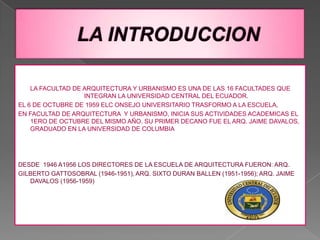 La Facultad de Arquitectura y Urbanismo de la Universidad Central del Ecuador se estableció el 6 de octubre de 1959 al transformarse la Escuela de Arquitectura. Comenzó sus actividades académicas el 1 de octubre de ese año bajo la dirección de su primer decano, el arquitecto Jaime Davalos, graduado de la Universidad de Columbia.