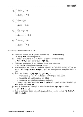 Este documento presenta un deber de cálculo diferencial que incluye varios problemas relacionados con geometría analítica. El deber requiere que el estudiante defina conceptos básicos como puntos, rectas, pendientes y distancias. También incluye ejercicios para encontrar ecuaciones de rectas, determinar si rectas son paralelas o perpendiculares, y resolver problemas adicionales relacionados con puntos, rectas y triángulos.