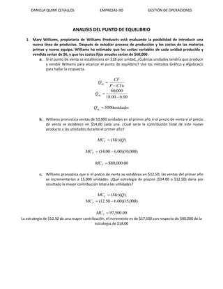 1) Williams Products está considerando introducir una nueva línea de productos con costos variables de $6 por unidad y costos fijos anuales de $60,000. Para alcanzar el punto de equilibrio si el precio es $18, debe producir 5,000 unidades. Un precio de $12.50 en lugar de $14 generaría una mayor contribución de $17,500.