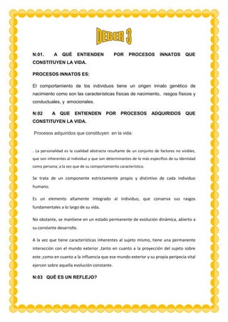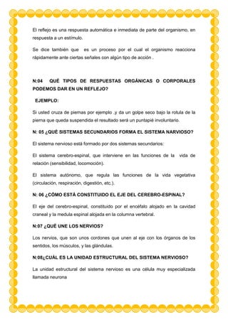 El documento contiene preguntas y respuestas sobre conceptos básicos de biología relacionados con el sistema nervioso. Define procesos innatos como comportamientos determinados genéticamente y procesos adquiridos como la personalidad, que se desarrolla a lo largo de la vida. Explica que un reflejo es una respuesta automática a un estímulo y que los nervios conectan el cerebro y la médula espinal con los órganos. Finalmente, distingue entre reflejos condicionados e incondicionados.