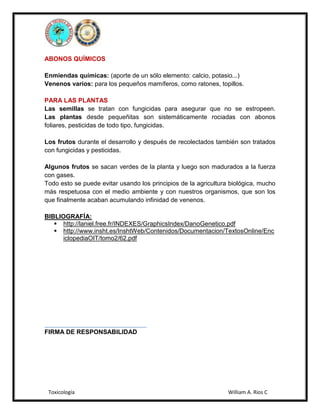 El documento describe los efectos de la intoxicación aguda por plomo en la población de La Victoria, Ecuador. Se analizaron muestras de sangre de personas expuestas al plomo debido a la producción artesanal de cerámica y se encontró que tenían niveles promedio de plomo 71 μg/dl, muy por encima del límite de 40 μg/dl. Esto causaba daños cromosómicos. El plomo contamina todo el ecosistema y causa problemas de salud. Se recomienda promover el uso de barnices sin p