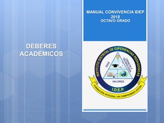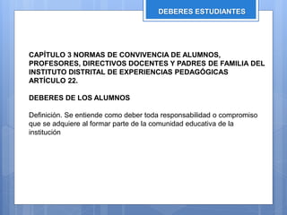 Este documento detalla los deberes académicos y de convivencia de los estudiantes del Instituto Distrital de Experiencias Pedagógicas. Entre los deberes académicos se encuentran asistir puntualmente a clases, realizar tareas a tiempo, traer útiles escolares, y cumplir con la carga horaria académica. Los deberes de convivencia incluyen respetar a los demás, aceptar las diferencias, usar adecuadamente las instalaciones y portar el uniforme con decoro.