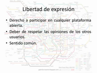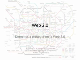 El documento aborda los derechos a proteger en la Web 2.0, incluyendo la libertad de expresión, el derecho a la intimidad, la protección de datos y la propiedad intelectual. Se enfatiza la importancia de respetar la veracidad de la información, la privacidad de las personas y las normativas relacionadas con la publicación de contenidos. También se ofrecen recursos para entender la cesión de derechos y los contenidos divulgables.