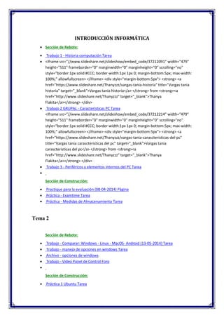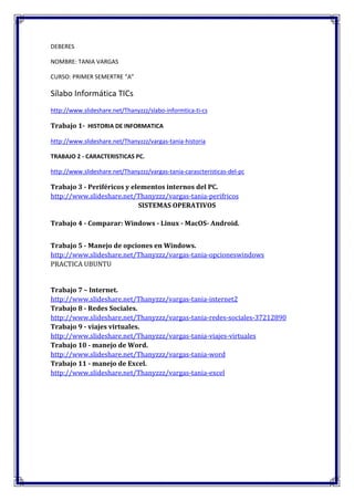 El documento detalla los deberes y proyectos asignados a Tania Vargas para su curso de primer semestre de Informática TICs. Incluye tareas sobre la historia de la informática, características de las PC, sistemas operativos, internet, redes sociales, programas de office y prácticas en Ubuntu, Word y Excel. Las tareas implican la creación de presentaciones y archivos en SlideShare y foros de discusión.