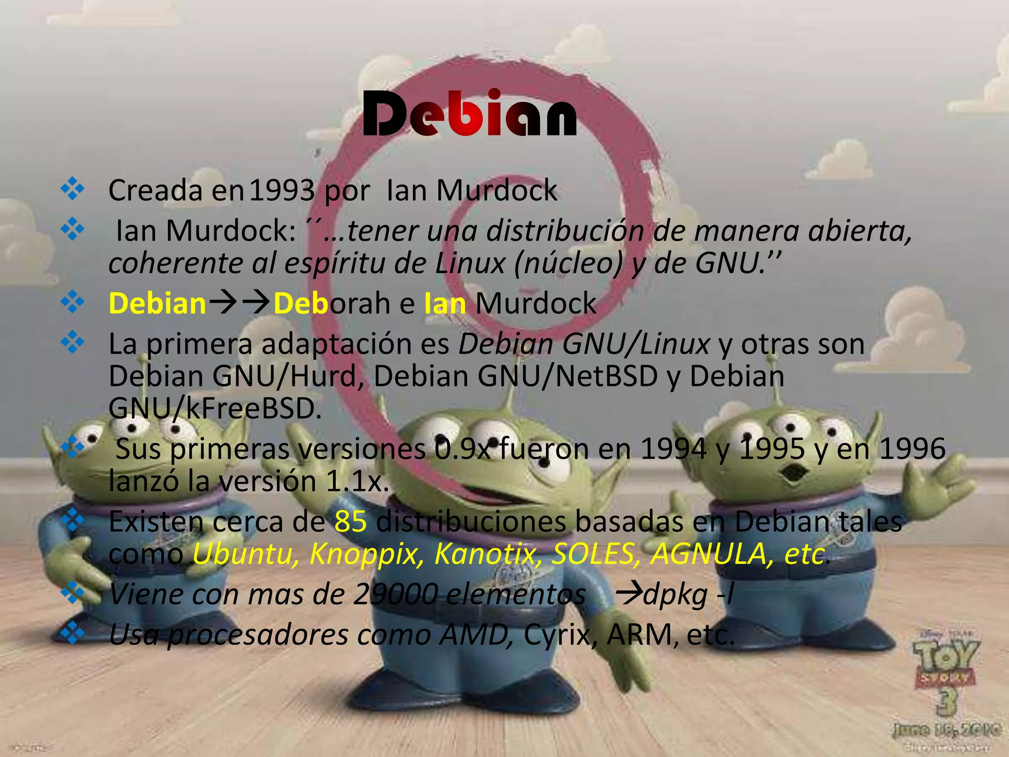 Debian es una distribución Linux creada en 1993 por Ian Murdock con el objetivo de tener una distribución de código abierto. Es una de las distribuciones más populares y ha inspirado a otras como Ubuntu. Viene con más de 29,000 paquetes de software libre y es conocida por su estabilidad, facilidad de uso y actualizaciones.